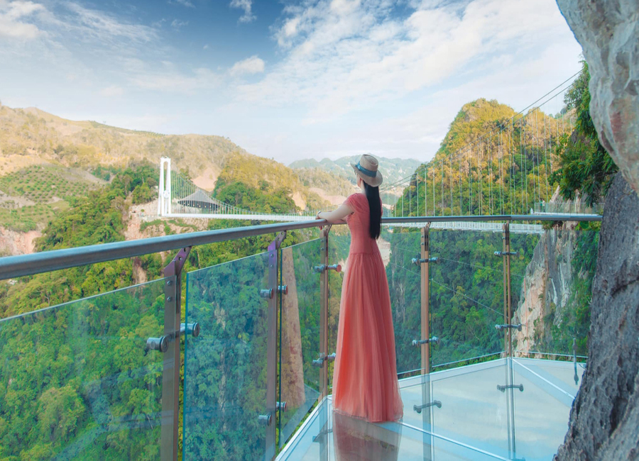 Qua cầu có đường Skywalk tiếp nối bằng kính dài 342m chạy dài bên vách núi đá, vực sâu 150m. Trên đường đi có 2 điểm nhô ra rộng 3m, dài 5m có tầm nhìn ra toàn cảnh khu du lịch, cầu kính màu trắng để du khách chụp ảnh check-in.