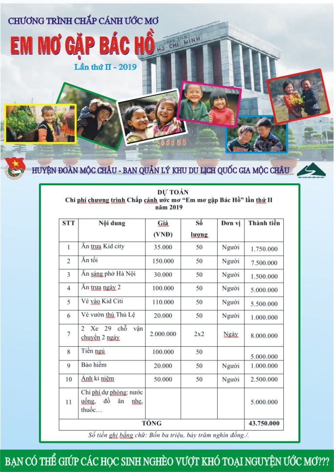 Chi đoàn BQL Khu du lịch quốc gia Mộc Châu xin thông báo và mong nhận được sự giúp đỡ từ các cá nhân, tổ chức, các nhà hảo tâm cùng chung tay để mang lại cho các em học sinh nghèo đạt thành tích cao trong học tập của huyện Mộc Châu có chuyến đi thăm quan đầy ý nghĩa và trọn vẹn. Hãy cùng biến giấc mơ được gặp Bác Hồ của những trẻ em nghèo vùng cao được trở thành hiện thực.